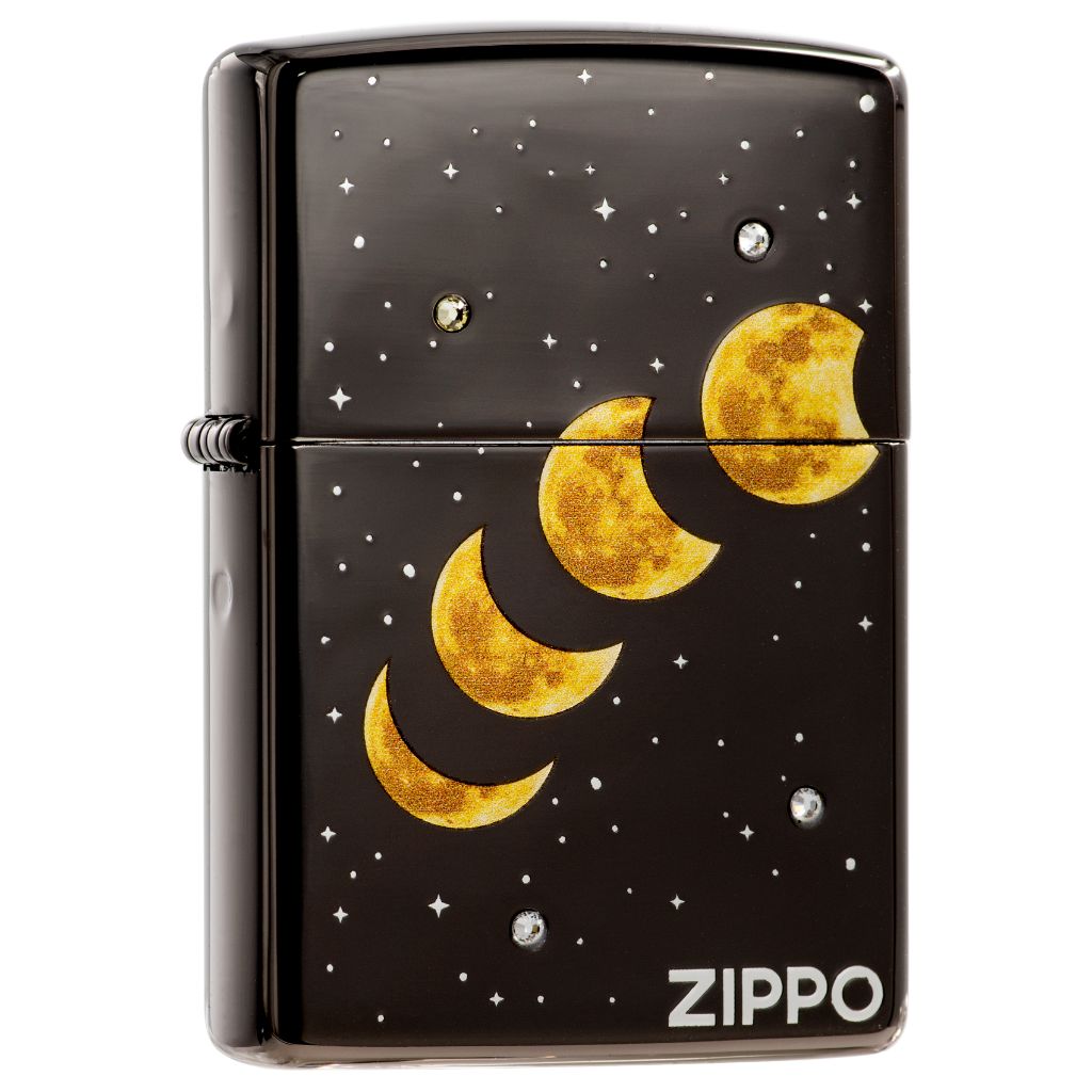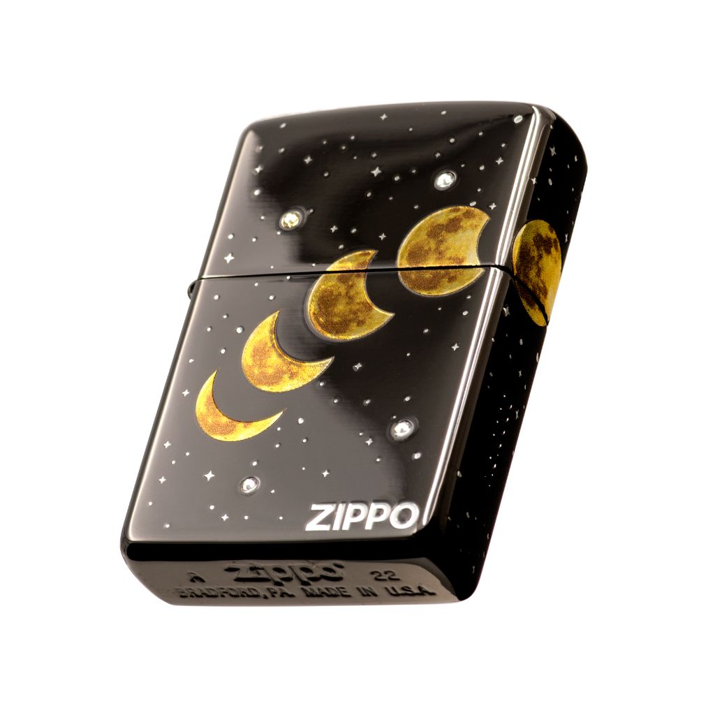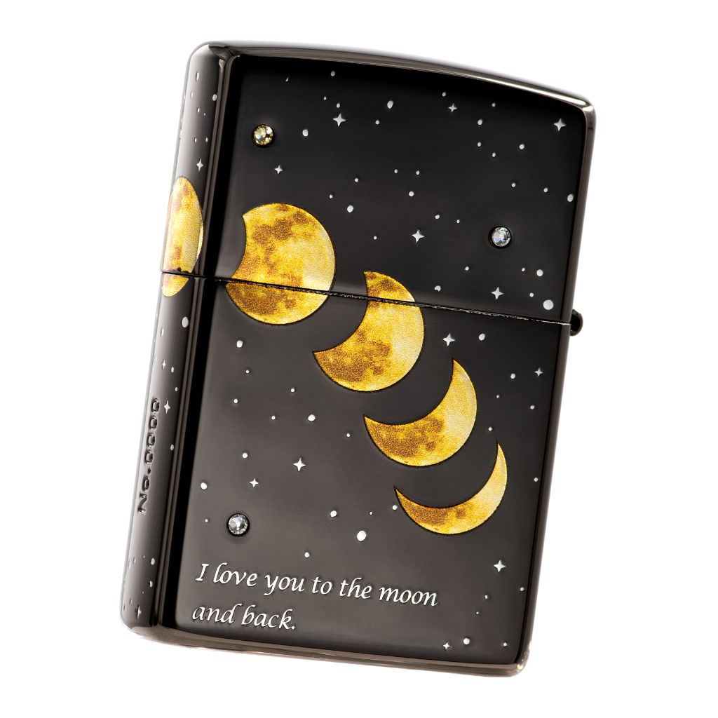 Zippo logo on the front and “I love you to the moon and back” on the back, moon phase pattern and stardust across three sides, 7 pieces of crystal were placed on the front and the back, serial number on the non-hinge side of the lighter.
