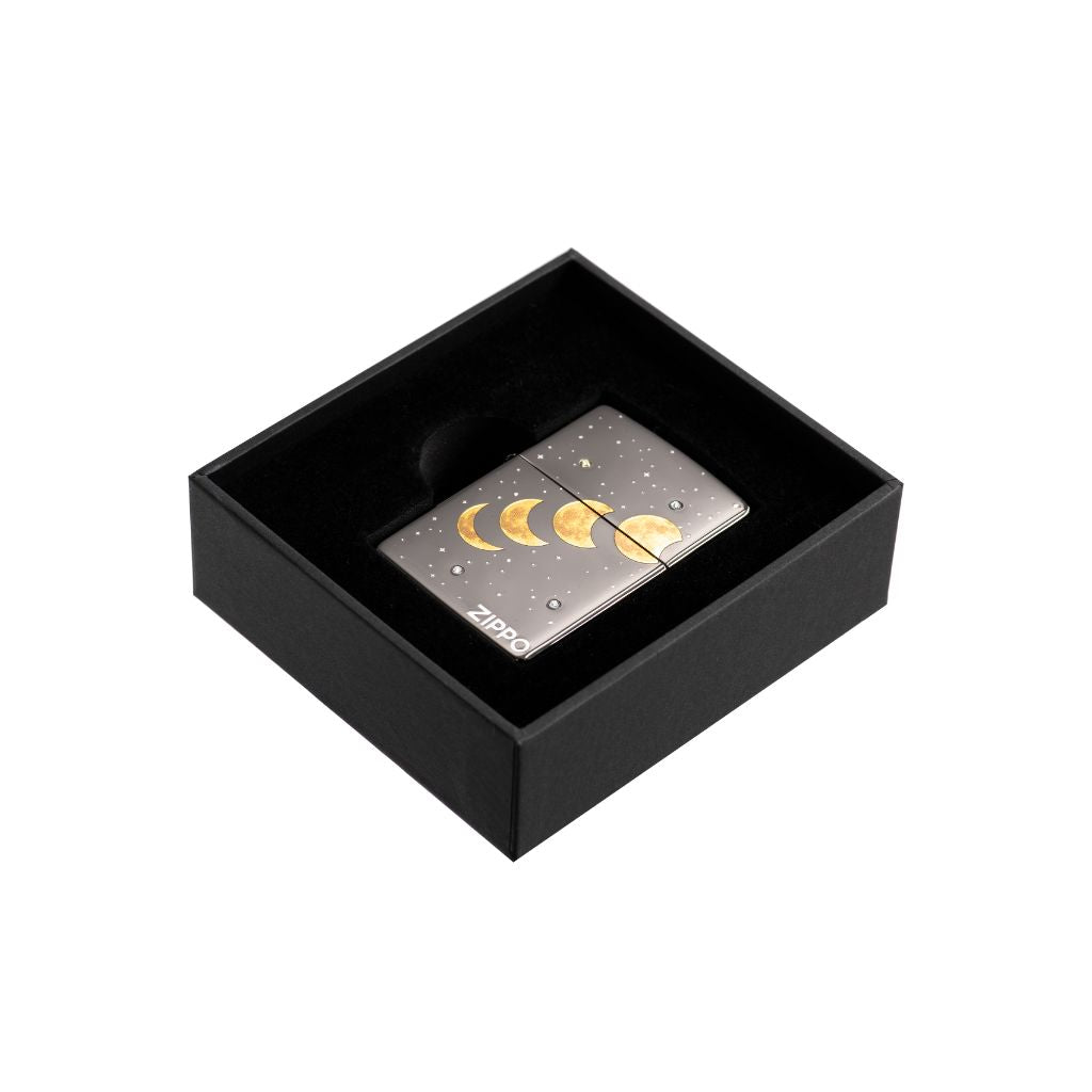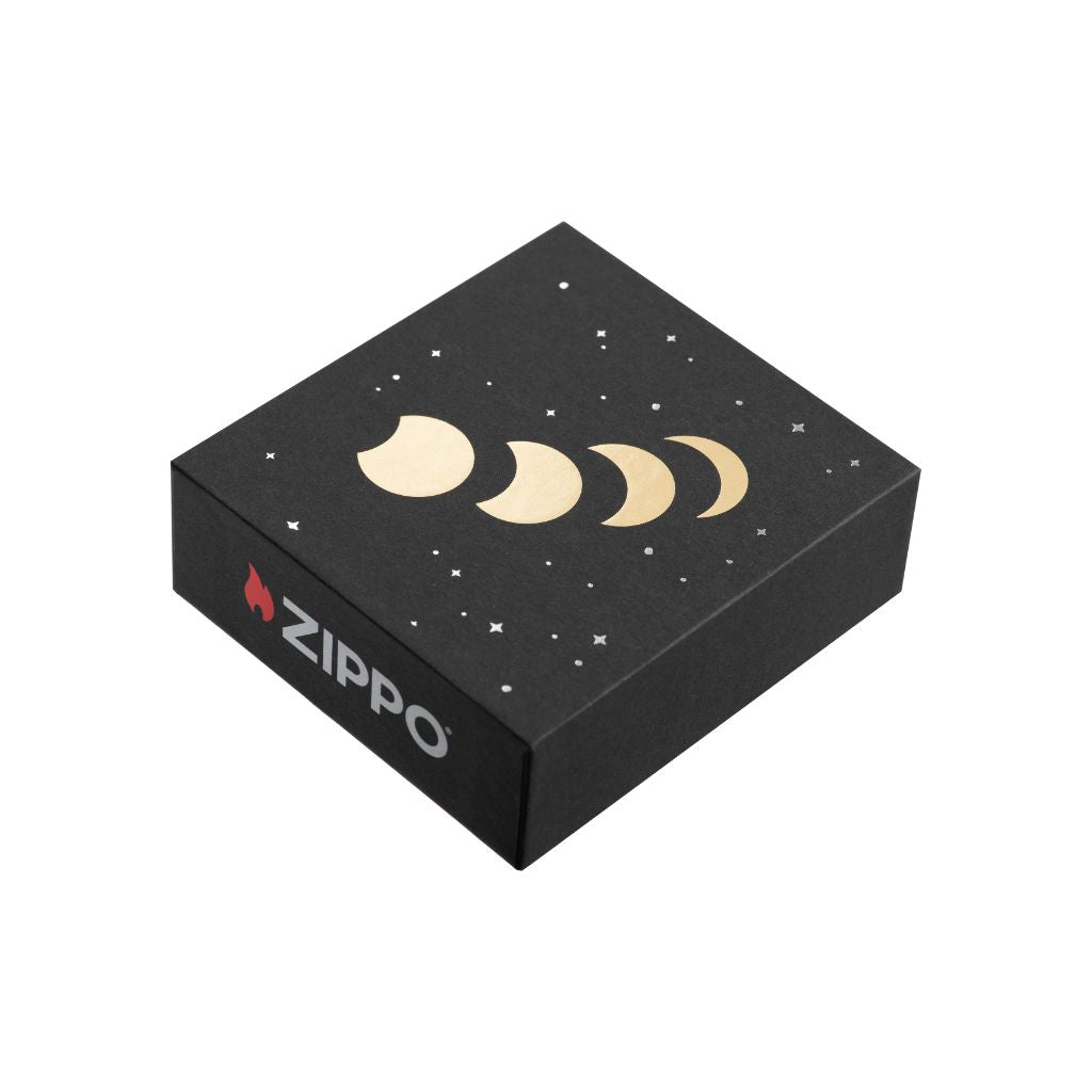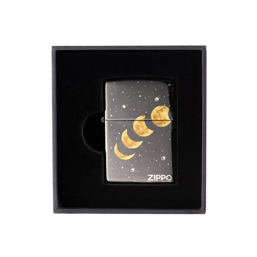 Zippo logo on the front and “I love you to the moon and back” on the back, moon phase pattern and stardust across three sides, 7 pieces of crystal were placed on the front and the back, serial number on the non-hinge side of the lighter.