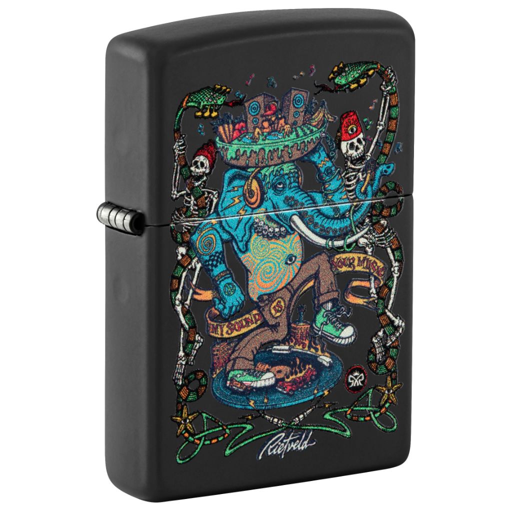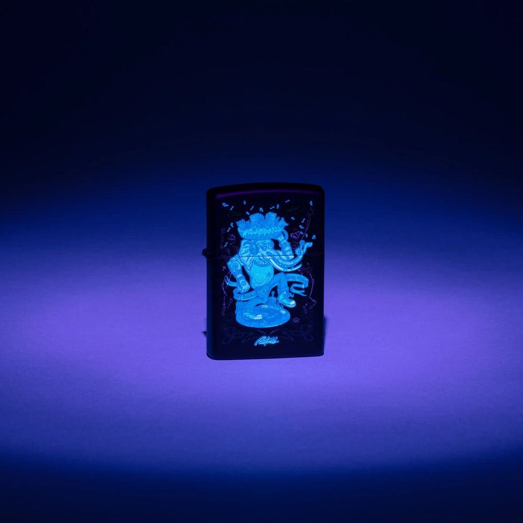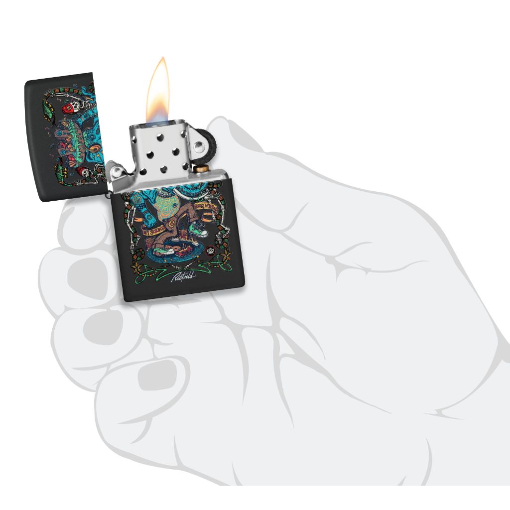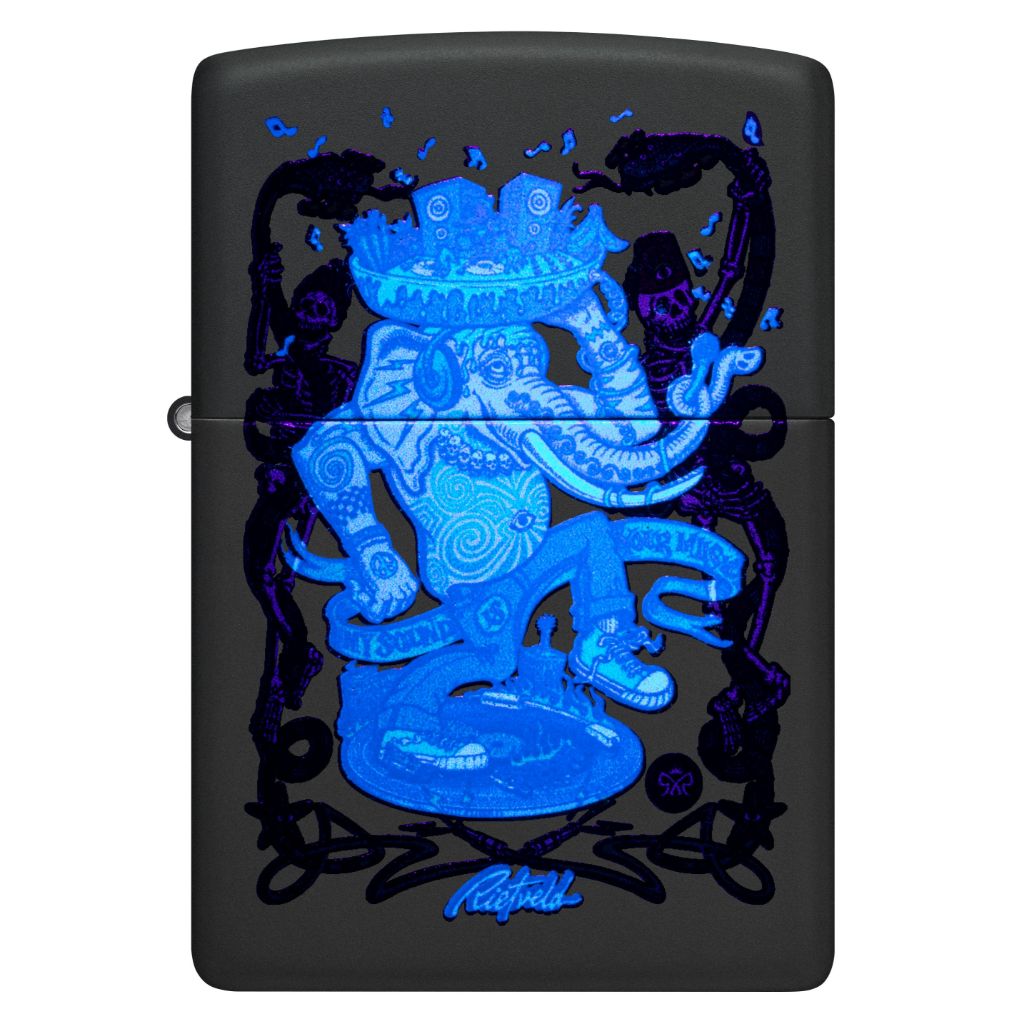 This classic Black Matte lighter is the perfect backdrop for another amazing Rick Rietveld creation. Replicating his iconic laid-back style, the intricate Color Image design features a groovy ensemble that illuminates under ultraviolet light thanks to our specialty Black Light process. Comes packaged in a gift box. For optimal performance, fill with Zippo lighter fuel.